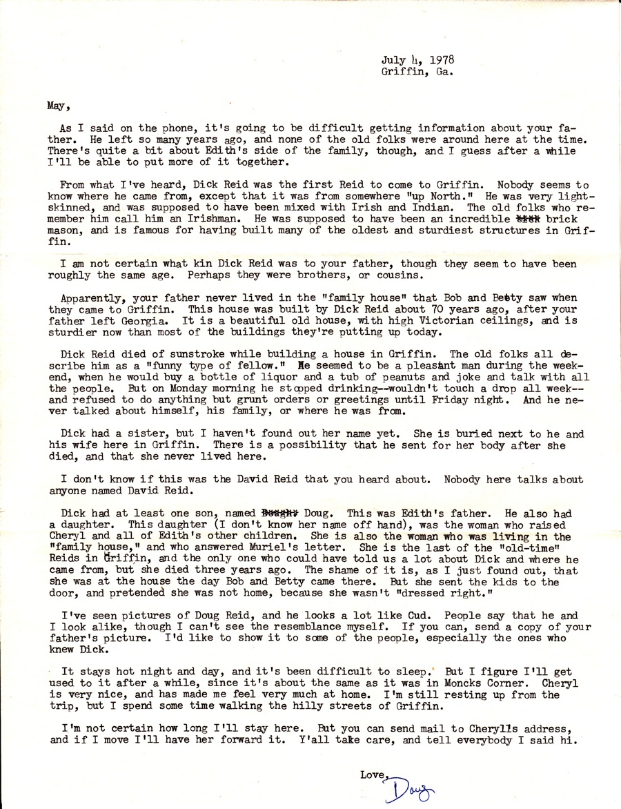 Dick had at least one son, named Doug. This was Edith's father. He also had a daughter. This daughter (I don't know her name off hand), was the woman who raised Cheryl and all of Edith's older children. She is also the woman who was living in the "family house," and who answered Muriel's letter. She is the last of the "old-time" Reids in Griffin, and the only one who could have told us a lot about Dick, and where he came from, but she died three years ago. The shame of it is, as I just found out, that she was at the house the day Bob and Betty came there. But she sent the kids to the door, and pretended she was not home, because she wasn't "dressed right."